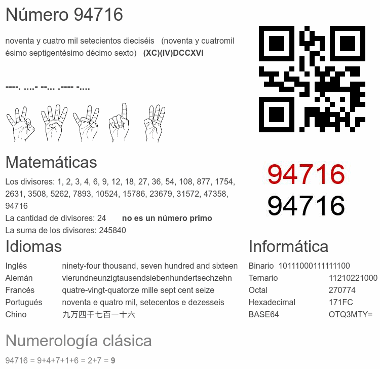 El número par 94 716 se dice 🔊, y se escribe con las palabras: noventa y cuatro mil setecientos dieciséis. El número ordinal 94716.° se dice 🔊 y se escribe como: noventa y cuatromilésimo septigentésimo décimo sexto. El significado del número 94716 en Matemáticas: Es un primo? Factorización y árbol de factores primos. La raíz cuadrada de y la raíz cúbica de 94716. El significado en informática, numerología, códigos e imágenes, escritura y denominación en otras lenguas. Otras curiosidades relacionadas con el 94716.