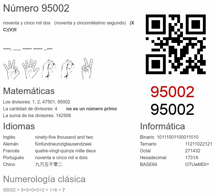 Si conoce algo interesante sobre el número 95002 o cualquier número natural (entero positivo), por favor escríbanos.Número 95 002 en otras unidades