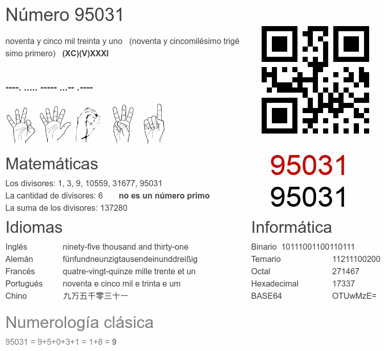 Si conoce algo interesante sobre el número 95031 o cualquier número natural (entero positivo), por favor escríbanos.Número 95 031 en otras unidades