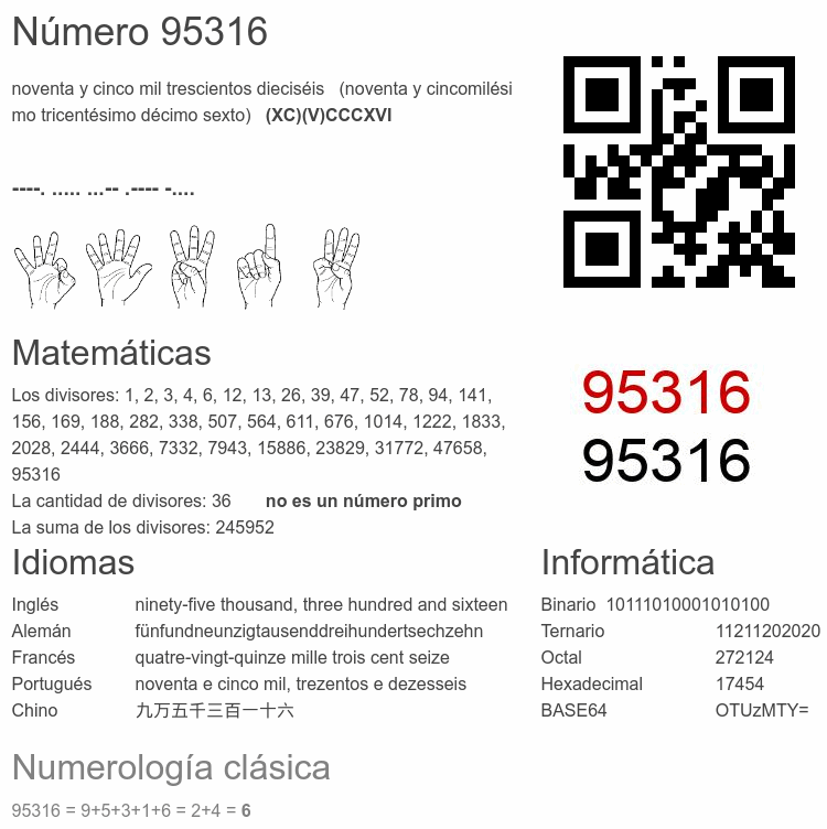 Si conoce algo interesante sobre el número 95316 o cualquier número natural (entero positivo), por favor escríbanos.Número 95 316 en otras unidades