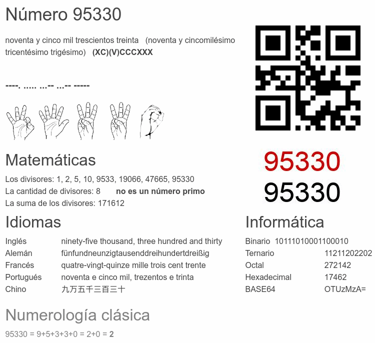 El número par 95 330 se dice 🔊, y se escribe con las palabras: noventa y cinco mil trescientos treinta. El número ordinal 95330.° se dice 🔊 y se escribe como: noventa y cincomilésimo tricentésimo trigésimo. El significado del número 95330 en Matemáticas: Es un primo? Factorización y árbol de factores primos. La raíz cuadrada de y la raíz cúbica de 95330. El significado en informática, numerología, códigos e imágenes, escritura y denominación en otras lenguas. Otras curiosidades relacionadas con el 95330.