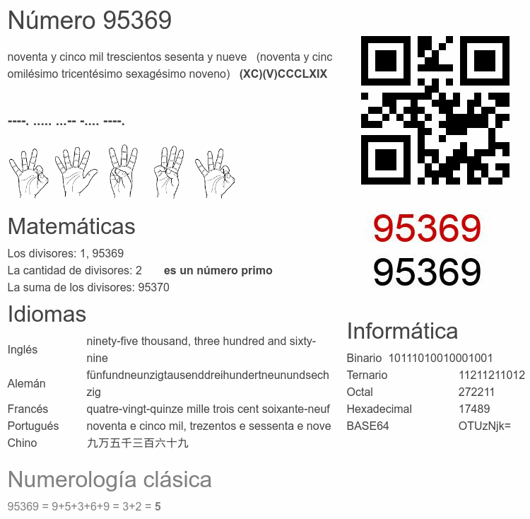 El número impar 95 369 se dice 🔊, y se escribe con las palabras: noventa y cinco mil trescientos sesenta y nueve. El número ordinal 95369.° se dice 🔊 y se escribe como: noventa y cincomilésimo tricentésimo sexagésimo noveno. El significado del número 95369 en Matemáticas: Es un primo? Factorización y árbol de factores primos. La raíz cuadrada de y la raíz cúbica de 95369. El significado en informática, numerología, códigos e imágenes, escritura y denominación en otras lenguas. Otras curiosidades relacionadas con el 95369.