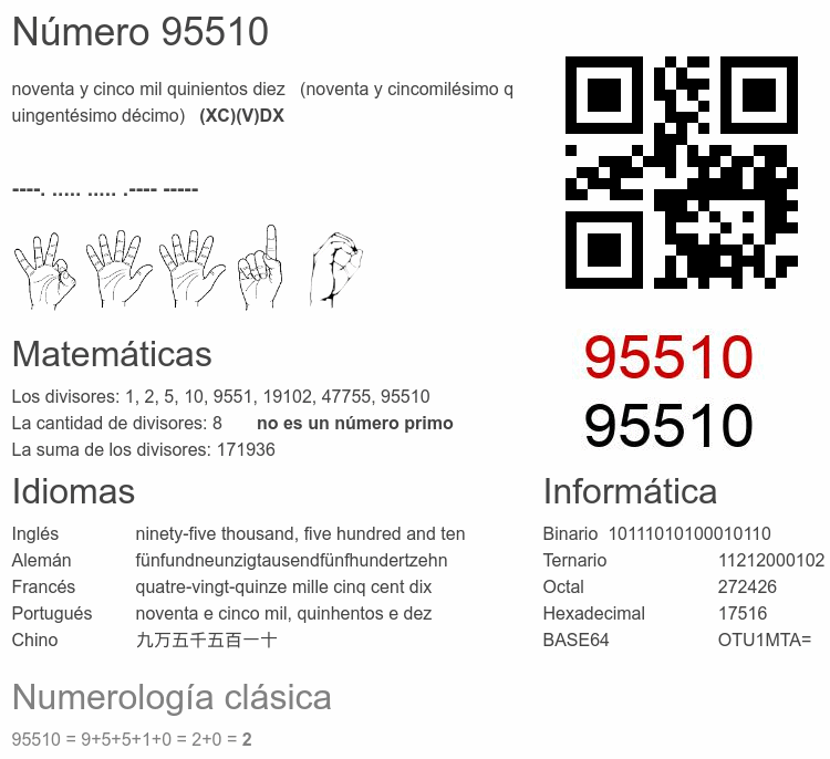 Si conoce algo interesante sobre el número 95510 o cualquier número natural (entero positivo), por favor escríbanos.Número 95 510 en otras unidades