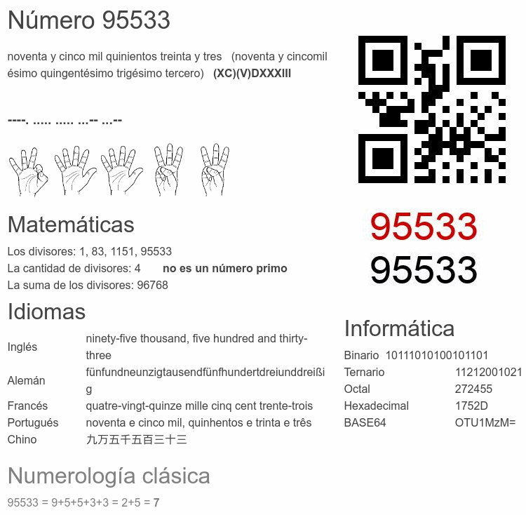 Si conoce algo interesante sobre el número 95533 o cualquier número natural (entero positivo), por favor escríbanos.Número 95 533 en otras unidades