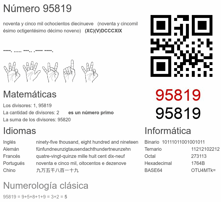 El número impar 95 819 se dice 🔊, y se escribe con las palabras: noventa y cinco mil ochocientos diecinueve. El número ordinal 95819.° se dice 🔊 y se escribe como: noventa y cincomilésimo octigentésimo décimo noveno. El significado del número 95819 en Matemáticas: Es un primo? Factorización y árbol de factores primos. La raíz cuadrada de y la raíz cúbica de 95819. El significado en informática, numerología, códigos e imágenes, escritura y denominación en otras lenguas. Otras curiosidades relacionadas con el 95819.