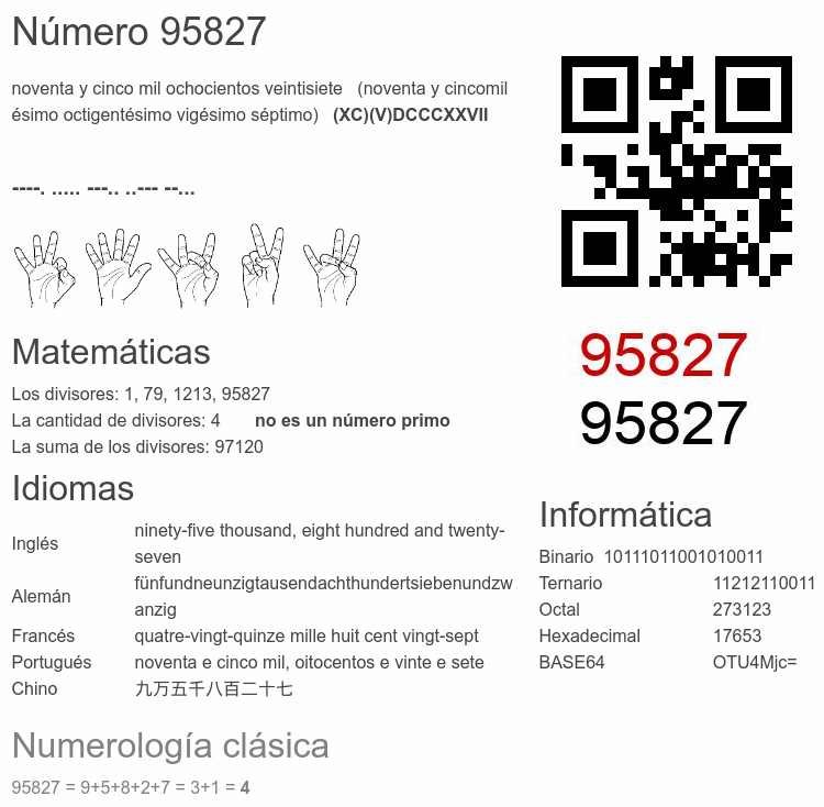 Si conoce algo interesante sobre el número 95827 o cualquier número natural (entero positivo), por favor escríbanos.Número 95 827 en otras unidades