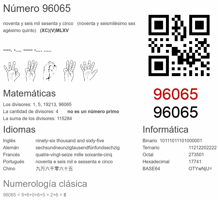 Número 96065 en el código morse: ----. -.... ----- -.... .....Lengua de Signos Española 96065: