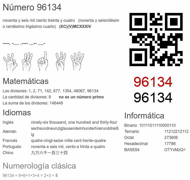 Si conoce algo interesante sobre el número 96134 o cualquier número natural (entero positivo), por favor escríbanos.Número 96 134 en otras unidades