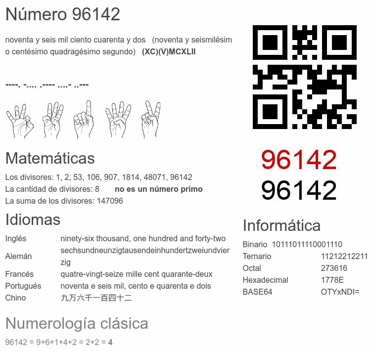 Si conoce algo interesante sobre el número 96142 o cualquier número natural (entero positivo), por favor escríbanos.Número 96 142 en otras unidades