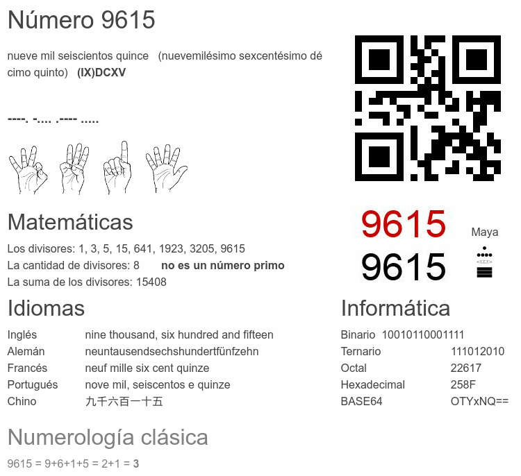 El número impar 9 615 se dice 🔊, y se escribe con las palabras: nueve mil seiscientos quince. El número ordinal 9615.° se dice 🔊 y se escribe como: nuevemilésimo sexcentésimo décimo quinto. El significado del número 9615 en Matemáticas: Es un primo? Factorización y árbol de factores primos. La raíz cuadrada de y la raíz cúbica de 9615. El significado en informática, numerología, códigos e imágenes, escritura y denominación en otras lenguas. Otras curiosidades relacionadas con el 9615.