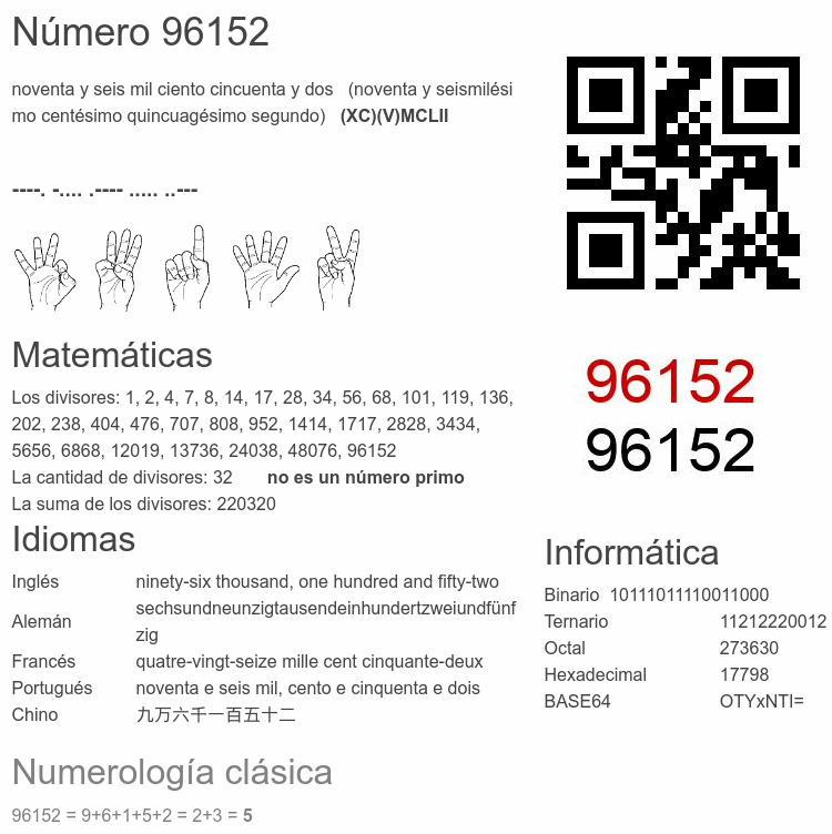 Si conoce algo interesante sobre el número 96152 o cualquier número natural (entero positivo), por favor escríbanos.Número 96 152 en otras unidades