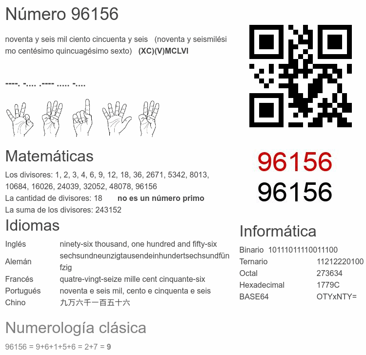 El número par 96 156 se dice 🔊, y se escribe con las palabras: noventa y seis mil ciento cincuenta y seis. El número ordinal 96156.° se dice 🔊 y se escribe como: noventa y seismilésimo centésimo quincuagésimo sexto. El significado del número 96156 en Matemáticas: Es un primo? Factorización y árbol de factores primos. La raíz cuadrada de y la raíz cúbica de 96156. El significado en informática, numerología, códigos e imágenes, escritura y denominación en otras lenguas. Otras curiosidades relacionadas con el 96156.