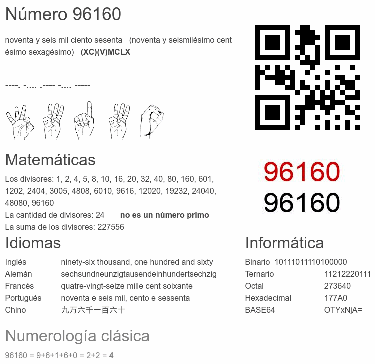 Número 96160 en el código morse: ----. -.... .---- -.... -----Lengua de Signos Española 96160: