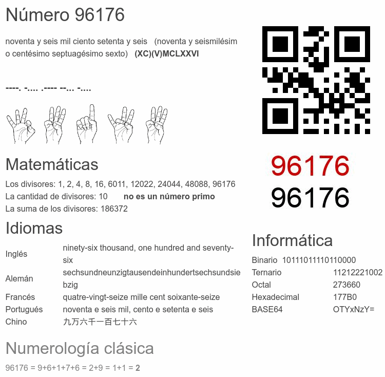 Si conoce algo interesante sobre el número 96176 o cualquier número natural (entero positivo), por favor escríbanos.Número 96 176 en otras unidades