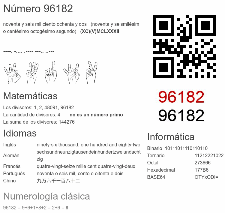 Si conoce algo interesante sobre el número 96182 o cualquier número natural (entero positivo), por favor escríbanos.Número 96 182 en otras unidades