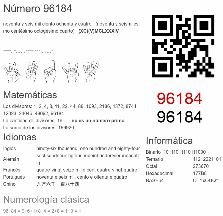 Si conoce algo interesante sobre el número 96184 o cualquier número natural (entero positivo), por favor escríbanos.Número 96 184 en otras unidades