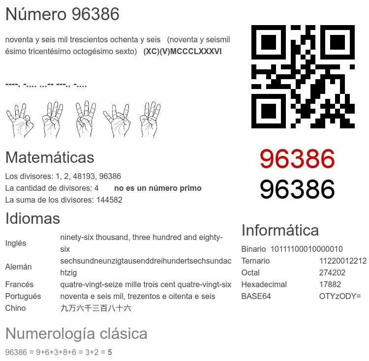 Si conoce algo interesante sobre el número 96386 o cualquier número natural (entero positivo), por favor escríbanos.Número 96 386 en otras unidades