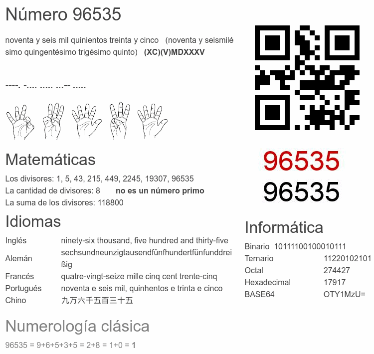 Si conoce algo interesante sobre el número 96535 o cualquier número natural (entero positivo), por favor escríbanos.Número 96 535 en otras unidades
