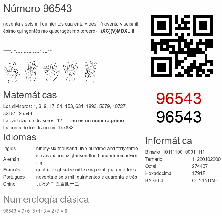 Si conoce algo interesante sobre el número 96543 o cualquier número natural (entero positivo), por favor escríbanos.Número 96 543 en otras unidades