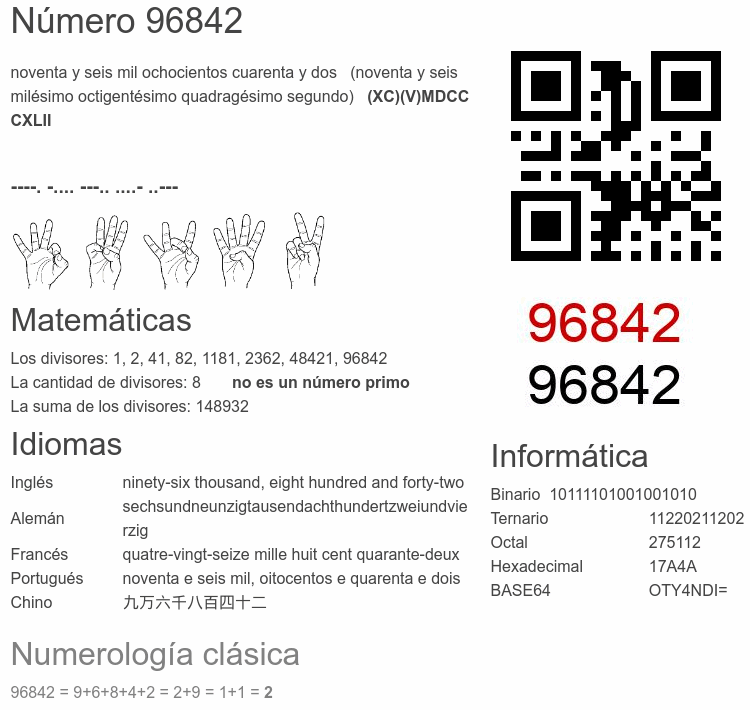 Si conoce algo interesante sobre el número 96842 o cualquier número natural (entero positivo), por favor escríbanos.Número 96 842 en otras unidades