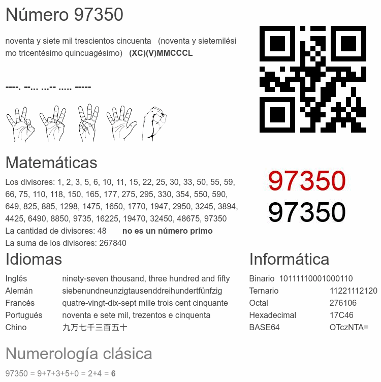 Si conoce algo interesante sobre el número 97350 que no ha encontrado en esta página, no dude en escríbanos aqui.