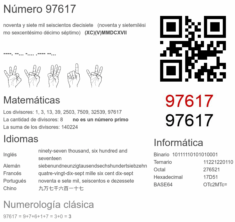 Si conoce algo interesante sobre el número 97617 o cualquier número natural (entero positivo), por favor escríbanos.Número 97 617 en otras unidades