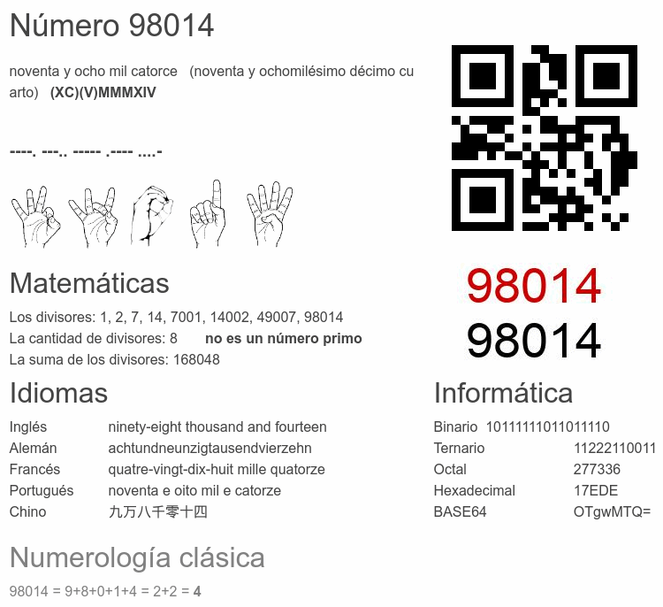 Si conoce algo interesante sobre el número 98014 o cualquier número natural (entero positivo), por favor escríbanos.Número 98 014 en otras unidades