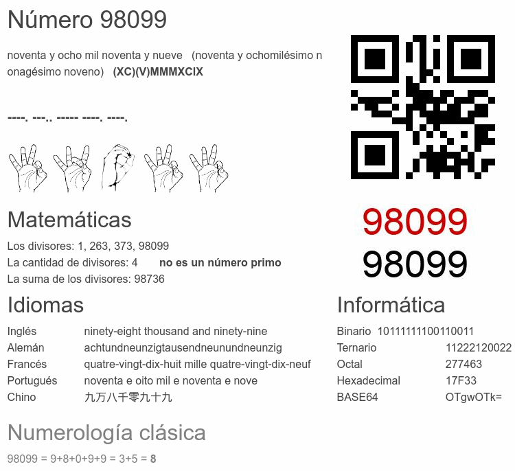 Número 98099 en el código morse: ----. ---.. ----- ----. ----.Lengua de Signos Española 98099: