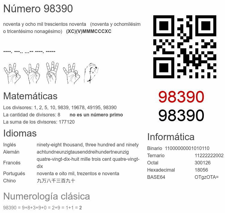 El número par 98 390 se dice 🔊, y se escribe con las palabras: noventa y ocho mil trescientos noventa. El número ordinal 98390.° se dice 🔊 y se escribe como: noventa y ochomilésimo tricentésimo nonagésimo. El significado del número 98390 en Matemáticas: Es un primo? Factorización y árbol de factores primos. La raíz cuadrada de y la raíz cúbica de 98390. El significado en informática, numerología, códigos e imágenes, escritura y denominación en otras lenguas. Otras curiosidades relacionadas con el 98390.
