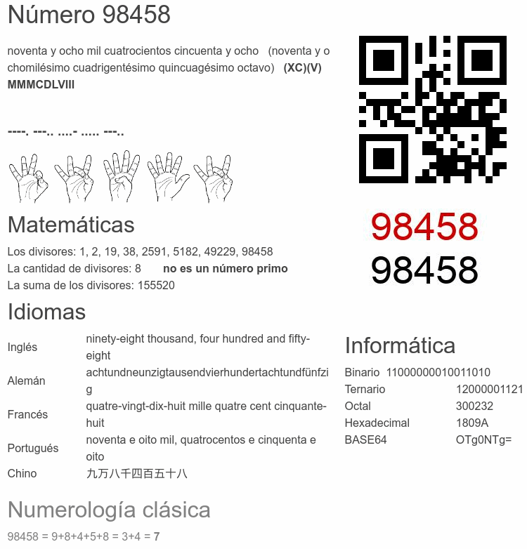 Si conoce algo interesante sobre el número 98458 o cualquier número natural (entero positivo), por favor escríbanos.Número 98 458 en otras unidades