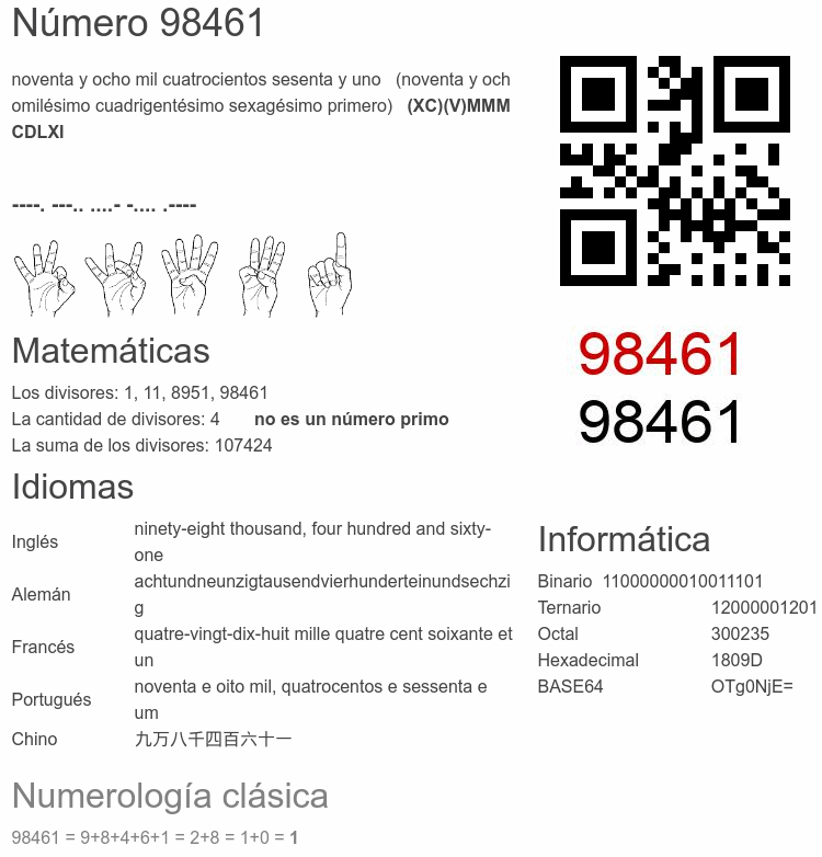Si conoce algo interesante sobre el número 98461 o cualquier número natural (entero positivo), por favor escríbanos.Número 98 461 en otras unidades
