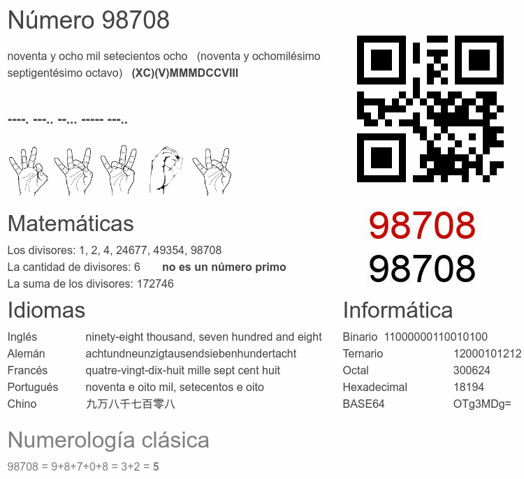 Si conoce algo interesante sobre el número 98708 o cualquier número natural (entero positivo), por favor escríbanos.Número 98 708 en otras unidades