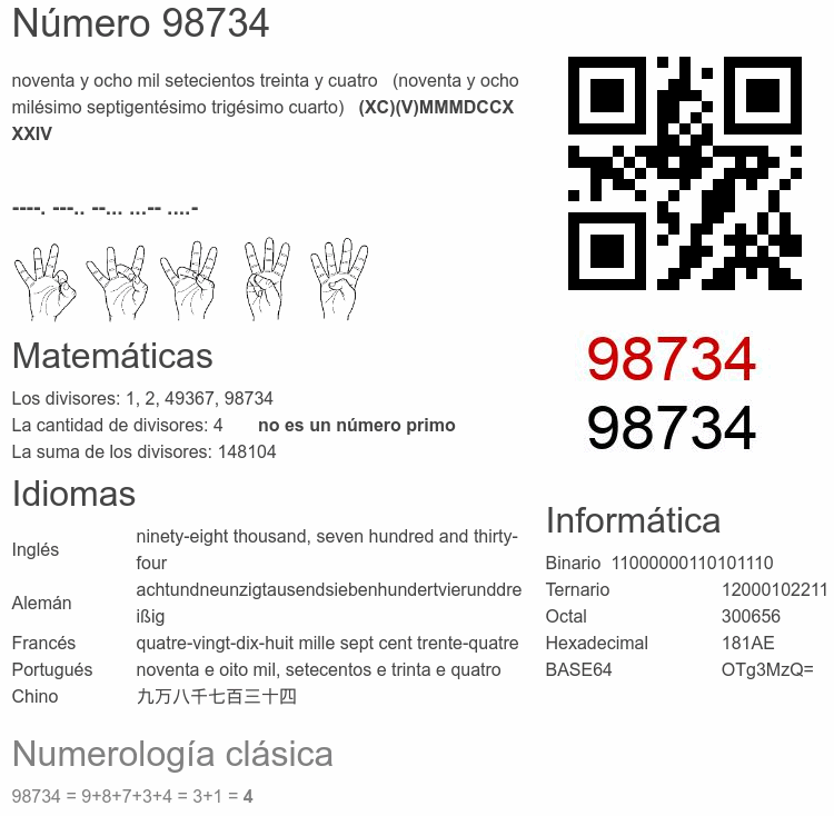 Si conoce algo interesante sobre el número 98734 o cualquier número natural (entero positivo), por favor escríbanos.Número 98 734 en otras unidades
