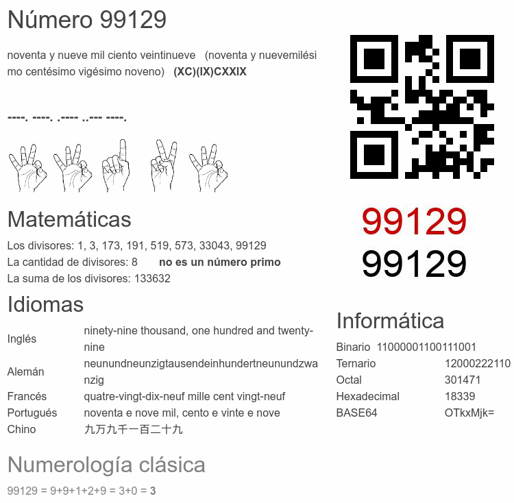 Si conoce algo interesante sobre el número 99129 o cualquier número natural (entero positivo), por favor escríbanos.Número 99 129 en otras unidades