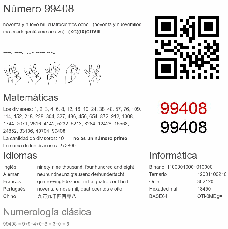 | Japonés: | 🔊 (数 99,408) | 九万九千四百八 |