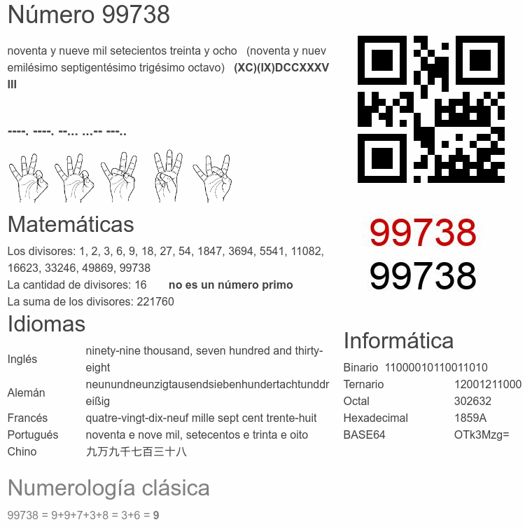 Si conoce algo interesante sobre el número 99738 o cualquier número natural (entero positivo), por favor escríbanos.Número 99 738 en otras unidades